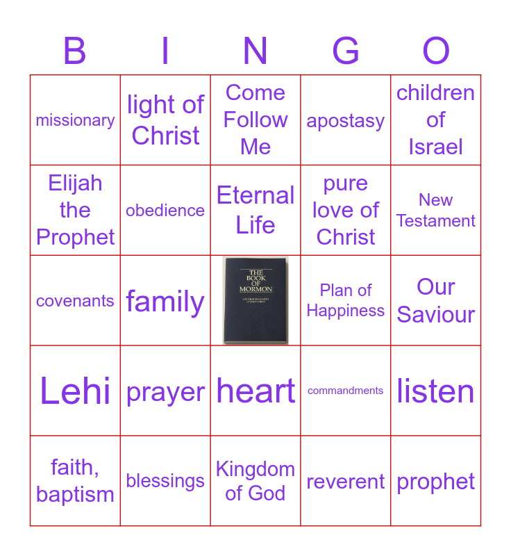 This bingo card has a free space and 73 words: Holy Bible, Toronto Temple, missionary, service, love, Nephi, Lehi, Jesus Christ, commandments, Book of Mormon, families are forever, happiness, obedience, Our Saviour, truth, light of Christ, Kingdom of God, Elijah the Prophet, Plan of Salvation, Plan of Happiness, Eternal Life, apostasy, children of Israel, preach the gospel, faith, baptism, Holy Ghost, miracles, Old Testament, still small voice, sacrifice, blessings, inspiration, remember, The Holy Spirit, family, worship, chapel, family history, prophet, President Russell M. Nelson, reverent, prayer, peace, humility, charity, pure love of Christ, Come Follow Me, widow of Zarephath, child of God, covenants, Sacrament, scriptures, 3 Nephi 11:3-7, open-hearted, D&C 8:2-3, revelation, Moses, heart, kindness, mercy, forgiveness, friendship, 1 Kings 18:21, New Testament, Second Coming, The Lord, Atonement of Jesus Christ, resurrection, listen, ponder, hymns, disciple and apostles.