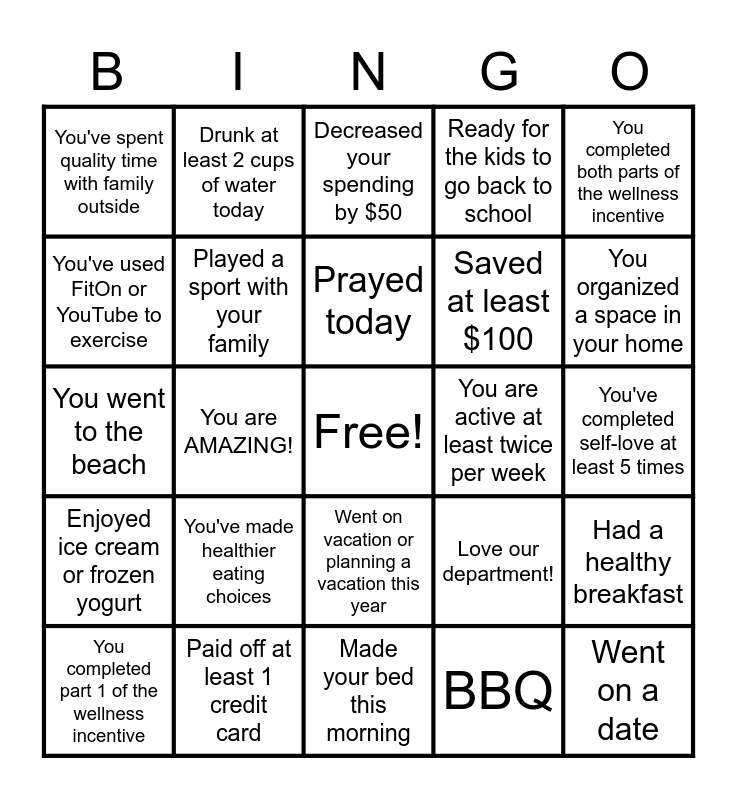 This bingo card has a free space and 29 words: You completed part 1 of the wellness incentive, Went to a theme/water park, You are AMAZING!, Made at least a B in one of your classes, You've spent quality time with family outside, Decreased your spending by $50, Played a sport with your family, You've made healthier eating choices, You are active at least twice per week, Paid off at least 1 credit card, You've completed self-love at least 5 times, Went on a date, Made your bed this morning, BBQ, You organized a space in your home, You achieved at least 1 of your goals, Went on vacation or planning a vacation this year, Enjoyed ice cream or frozen yogurt, You completed both parts of the wellness incentive, You went to the beach, Love our department!, You smiled today, Saved at least $100, You've used FitOn or YouTube to exercise, Ready for the kids to go back to school, Drunk at least 2 cups of water today, Had a healthy breakfast, Prayed today and Watched a Christmas movie on Hallmark.