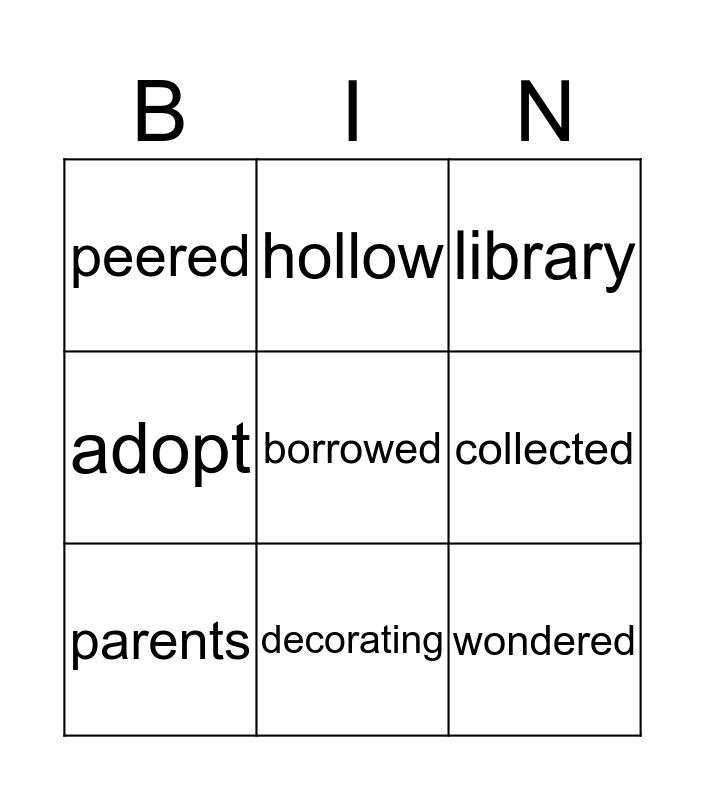 This bingo card has 9 words: parents, library, hollow, adopt, peered, collected, borrowed, wondered and decorating.
