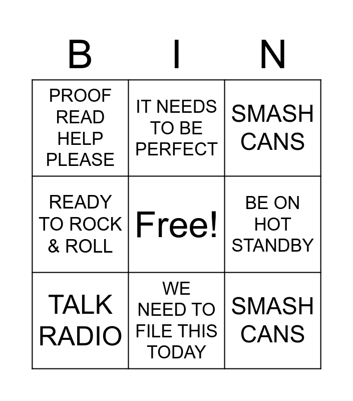 This bingo card has a free space and 8 words: BE ON HOT STANDBY, SMASH CANS, IT NEEDS TO BE PERFECT, TALK RADIO, PROOF READ HELP PLEASE, SMASH CANS, READY TO ROCK & ROLL and WE NEED TO FILE THIS TODAY.