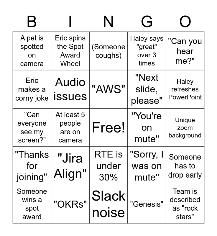 This bingo card has a free space and 29 words: Someone wins a spot award, Background noise, At least 5 people are on camera, Someone uses the clap reaction, A pet is spotted on camera, (Someone coughs), Audio issues, "Jira Align", "You're on mute", "OKRs", Unique zoom background, Team is described as "rock stars", Slack noise, "Genesis", Haley refreshes PowerPoint, Someone mentions return to office, RTE is under 30%, "Thanks for joining", "Can you hear me?", "Can everyone see my screen?", "Sorry, I was on mute", Denise's dogs bark, "Next slide, please", Eric makes a corny joke, Haley says "great" over 3 times, Eric spins the Spot Award Wheel, Someone has to drop early, "AWS" and "Let me just share my screen...".