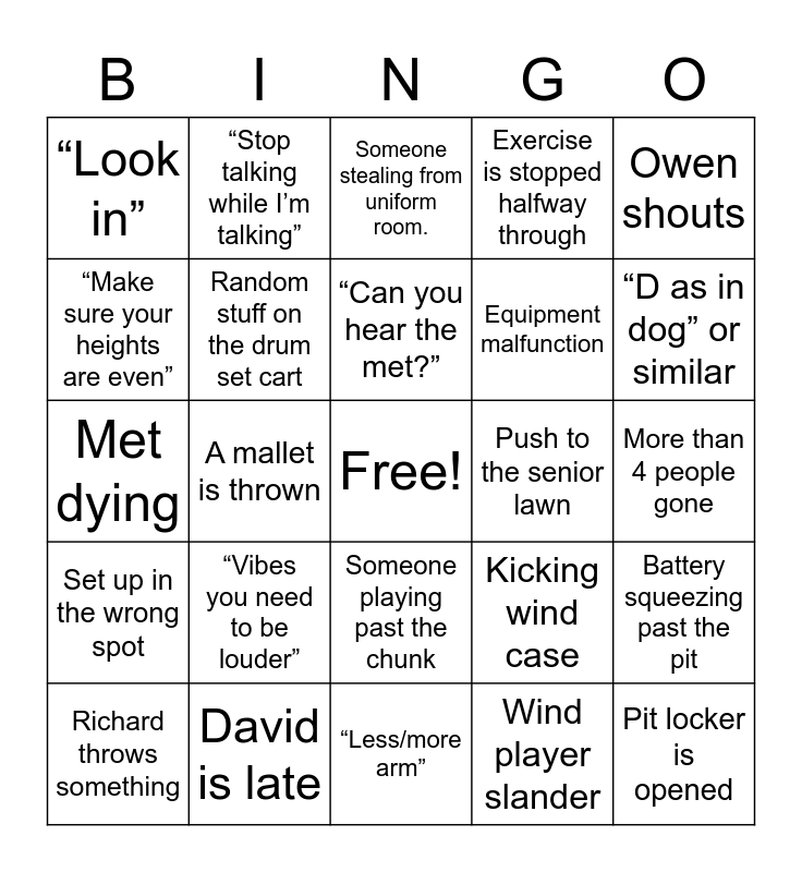 This bingo card has a free space and 25 words: “Vibes you need to be louder”, “Less/more arm”, “Can you hear the met?”, Richard throws something, Owen shouts, “Look in”, “Make sure your heights are even”, “Stop talking while I’m talking”, Push to the senior lawn, Someone playing past the chunk, Equipment malfunction, Met dying, Kicking wind case, Battery squeezing past the pit, Random stuff on the drum set cart, Someone drawing on the whiteboard, More than 4 people gone, Someone stealing from uniform room., “D as in dog” or similar, A mallet is thrown, Pit locker is opened, David is late, Set up in the wrong spot, Exercise is stopped halfway through and Wind player slander.
