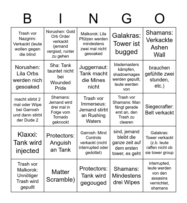 This bingo card has 51 words: Free!, Trash vor Immerseus: Jemand stirbt an Rushing Waters, Immerseus: Jemand stirbt, Protectors: Tank wird gegouged, Protectors: Anguish an Tank, Nach Protectors: Vanity gepullt, Norushen: Gold Orb Order verkackt (jemand vergisst, runter zu gehen, oder geht zu früh), Norushen: Lila Orbs werden nich gesoaked, Trash vor Sha: Mindestens der halbe Raid stirbt, Sha: Tank tauntet nicht bei Wounded Pride, Galakras: Tower ist bugged, Galakras: Tower verkackt (z.b. leute raffen nicht ob sie tower group, sind, jemand bleibt die ganze zeit auf dem ersten tower, es geht, ewig niemand auf den ersten tower wenn der zweite fertig ist etc.), Juggernaut: Leute werden nach Afrika geblastet, Juggernaut: Tank macht die Mines nicht, Trash vor Shamans: Man fängt gerade erst an, den Trash zu clearen, und es rennt schon jemand los, um die Kisten zu looten, Shamans: Verkackte Ashen Wall, Shamans: Jemand wird drei mal in Folge vom Tornado geknockt, Shamans: Mindestens drei Wipes, Trash vor Nazgrim: Verkackt (leute wollen gegen die blind, blademasters kämpfen, shadowmages werden gepullt, leute werden von, den katapulten gekillt, tank stirbt weil mind spike nicht, interrupted, leute werden von den assasins vernichtet, shamans, brauchen gefühlte zwei stunden, etc.), Nazgrim: Boss wird geheilt, Trash vor Malkorok: Unnötiger Trash wird gepullt, Malkorok: Lila Pfützen werden mindestens zwei mal nicht gesoaked, (beim selben Versuch), Malkorok: Jemand steht in Breath of Y'Shaarj, Malkorok: Leute wissen nicht, wie Blood Rage funktioniert (stacken, nicht oder gehen bei Displaced Energy nicht raus), Spoils: Anima Golem Mechanic verkackt (Crimson Reconstruction oder, Matter Scramble), Thok: Leute verkacken Fixate (laufen nicht oder laufen zum Jailer), Thok: Jemand außer der Tank nimmt den Schlüssel vom Jailer, Siegecrafter: Es sind mindestens drei Leute im Raid die Belt machen, können aber keiner will, Siegecrafter: Belt verkackt, Klaxxi: Tank wird injected, Klaxxi: Amber wird nicht gekillt, Klaxxi: Niemand greift Kuchongs an, Klaxxi: Leute werden von Whirlwind getroffen, Trash vor Garrosh: Trash Skip geht nach hinten los (der Dude der das, macht stirbt 2 mal oder Wipe bei Garrosh und dann stirbt der Dude 2, mal wenn mans nochmal skippen muss), Garrosh: Leute haben keinen Buff in der Intermission Phase, Garrosh: Mind Controls verkackt (nicht interrupted oder gedottet) and Garrosh: bei Whirlwind nicht gespreaded.