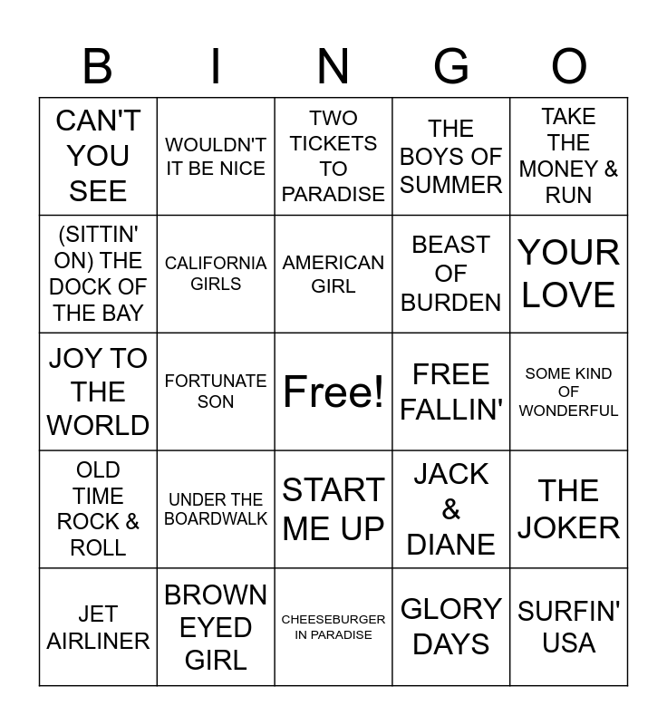 This bingo card has a free space and 47 words: MARGARITAVILLE, SURFIN' USA, ALL SUMMER LONG, CHEESEBURGER IN PARADISE, UNDER THE BOARDWALK, FINS, WOULDN'T IT BE NICE, TAKE IT EASY, (SITTIN' ON) THE DOCK OF THE BAY, IN THE SUMMERTIME, CALIFORNIA GIRLS, THE BOYS OF SUMMER, THE JOKER, JACK & DIANE, BRANDY, MY GIRL, AMERICAN GIRL, FREE FALLIN', SMALL TOWN, TAKE THE MONEY & RUN, FORTUNATE SON, GLORY DAYS, CAN'T YOU SEE, BEAST OF BURDEN, PINK HOUSES, YOUR LOVE, JET AIRLINER, DANCING IN THE DARK, START ME UP, OLD TIME ROCK & ROLL, STUCK IN THE MIDDLE WITH YOU, INTO THE MYSTIC, KEEP YOUR HANDS TO YOURSELF, GOING UP THE COUNTRY, ALL SHE WANTS TO DO IS DANCE, BROWN EYED GIRL, SOME KIND OF WONDERFUL, TAKIN' CARE OF BUSINESS, AMERICAN PIE, CHERRY BOMB, SPIRIT IN THE SKY, TWO TICKETS TO PARADISE, JOY TO THE WORLD, CENTERFIELD, BANG THE DRUM ALL DAY, STILL THE ONE and AFTERNOON DELIGHT.