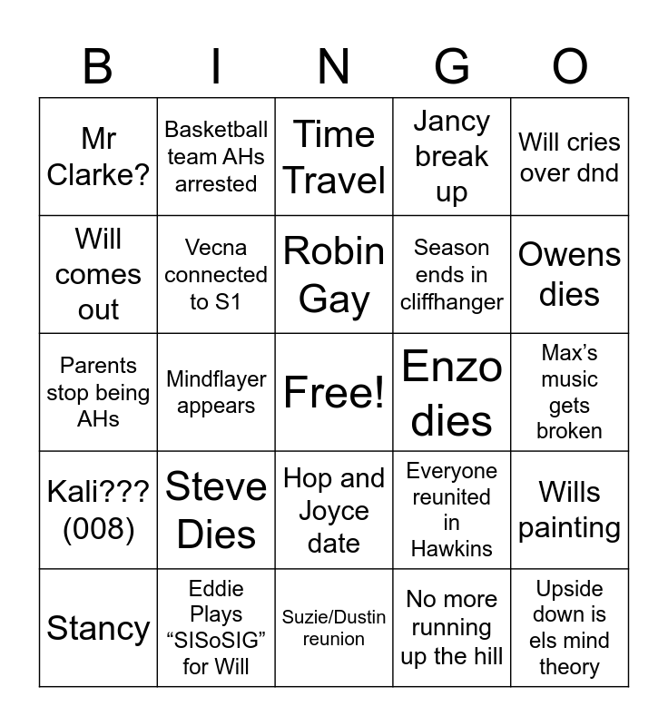 This bingo card has a free space and 24 words: Steve Dies, Eddie Plays “SISoSIG” for Will, Robin Gay, Stancy, Will cries over dnd, Mr Clarke?, Will comes out, Basketball team AHs arrested, Enzo dies, Hop and Joyce date, Season ends in cliffhanger, Parents stop being AHs, Everyone reunited in Hawkins, Wills painting, Vecna connected to S1, No more running up the hill, Max’s music gets broken, Time Travel, Owens dies, Mindflayer appears, Upside down is els mind theory, Kali??? (008), Jancy break up and Suzie/Dustin reunion.