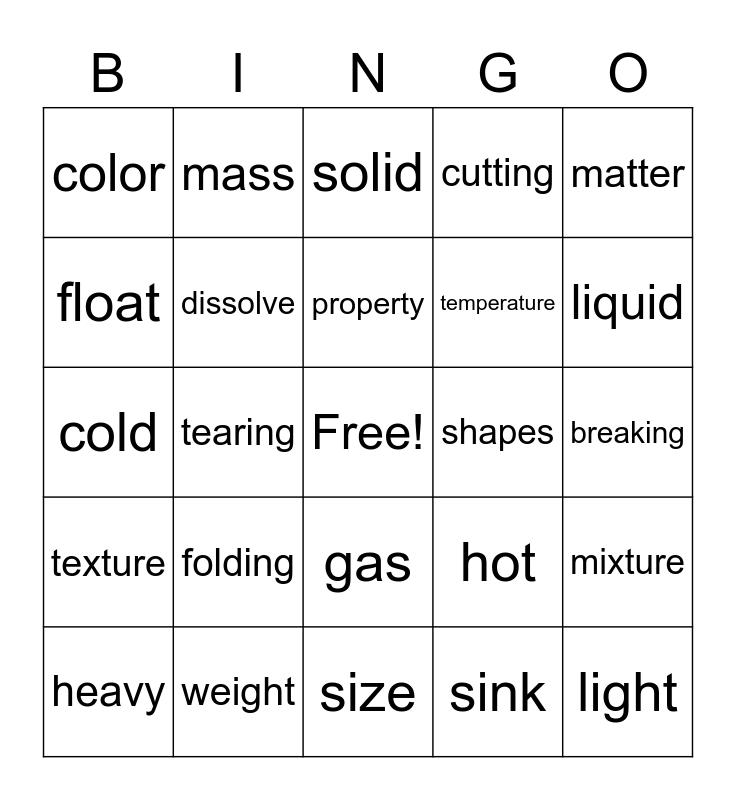 This bingo card has a free space and 24 words: folding, weight, property, heavy, matter, color, float, mass, shapes, gas, temperature, cold, hot, mixture, dissolve, sink, breaking, solid, liquid, tearing, light, texture, cutting and size.
