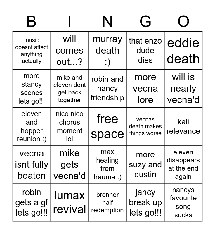 This bingo card has a free space and 24 words: mike gets vecna'd, lumax revival, robin and nancy friendship, robin gets a gf lets go!!!, eddie death, music doesnt affect anything actually, more stancy scenes lets go!!!, will comes out...?, vecnas death makes things worse, max healing from trauma :), more vecna lore, eleven and hopper reunion :), more suzy and dustin, eleven disappears at the end again, mike and eleven dont get back together, jancy break up lets go!!!, kali relevance, murray death :), will is nearly vecna'd, nico nico chorus moment lol, nancys favourite song sucks, vecna isnt fully beaten, that enzo dude dies and brenner half redemption.