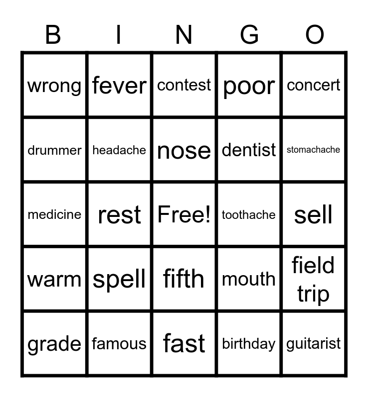 This bingo card has a free space and 24 words: spell, famous, nose, grade, concert, wrong, drummer, fever, toothache, fifth, dentist, medicine, mouth, field trip, headache, birthday, sell, contest, stomachache, rest, guitarist, warm, poor and fast.