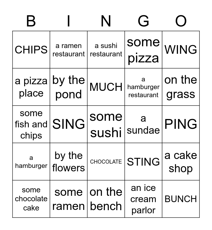 This bingo card has a free space and 28 words: a cake shop, a fish and chip shop, a hamburger restaurant, an ice cream parlor, a pizza place, a sushi restaurant, a ramen restaurant, a hamburger, a sundae, some chocolate cake, some fish and chips, some pizza, some ramen, on the bench, on the grass, under the tree, by the flowers, by the pond, MUCH, CHOCOLATE, CHIPS, CHIN, BUNCH, SING, PING, STING, WING and WRONG.