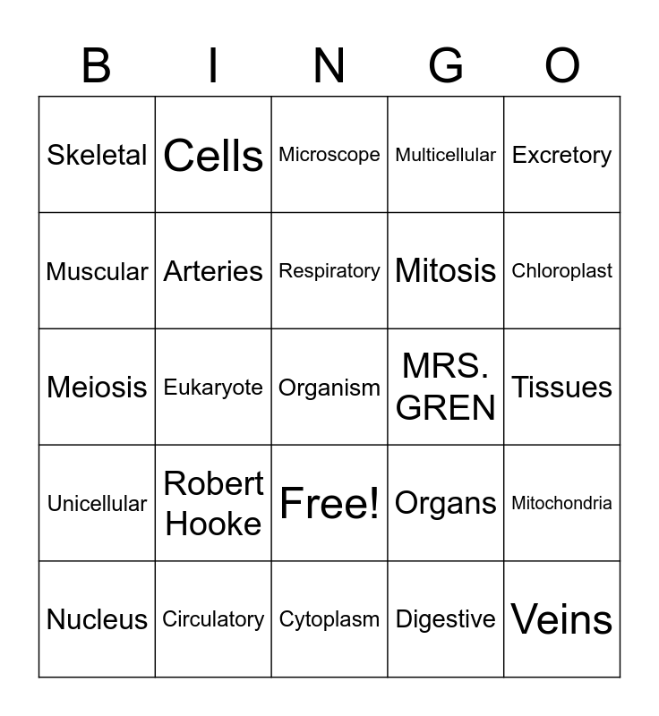 This bingo card has 26 words: Free!, Digestive, Respiratory, Circulatory, Excretory, Skeletal, Muscular, Cells, Tissues, Organs, Mitosis, Meiosis, Mitochondria, Nucleus, Eukaryote, Prokaryote, Multicellular, Unicellular, Microscope, Organism, Chloroplast, Cytoplasm, MRS. GREN, Robert Hooke, Arteries and Veins.