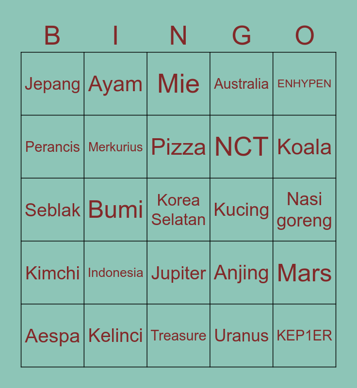 This bingo card has 25 words: Kimchi, Kelinci, Korea Selatan, Uranus, ENHYPEN, Jepang, Ayam, Mie, Kucing, Mars, Perancis, Merkurius, Treasure, Anjing, Koala, Aespa, Bumi, Pizza, NCT, Nasi goreng, Seblak, Indonesia, Jupiter, Australia and KEP1ER.