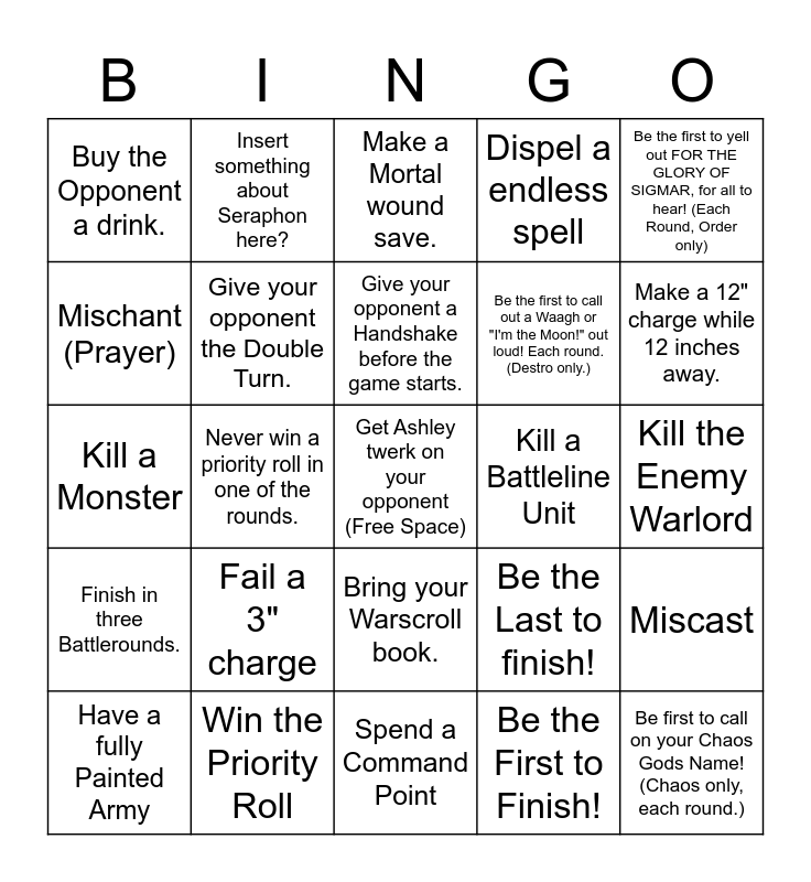 This bingo card has a free space and 24 words: Fail a 3" charge, Win the Priority Roll, Give your opponent a Handshake before the game starts., Have a fully Painted Army, Be the first to yell out FOR THE GLORY OF SIGMAR, for all to hear! (Each Round, Order only), Buy the Opponent a drink., Mischant (Prayer), Insert something about Seraphon here?, Kill a Battleline Unit, Bring your Warscroll book., Be the first to call out a Waagh or "I'm the Moon!" out loud! Each round. (Destro only.), Kill a Monster, Be the Last to finish!, Miscast, Give your opponent the Double Turn., Be the First to Finish!, Kill the Enemy Warlord, Make a Mortal wound save., Make a 12" charge while 12 inches away., Never win a priority roll in one of the rounds., Be first to call on your Chaos Gods Name! (Chaos only, each round.), Finish in three Battlerounds., Dispel a endless spell and Spend a Command Point.