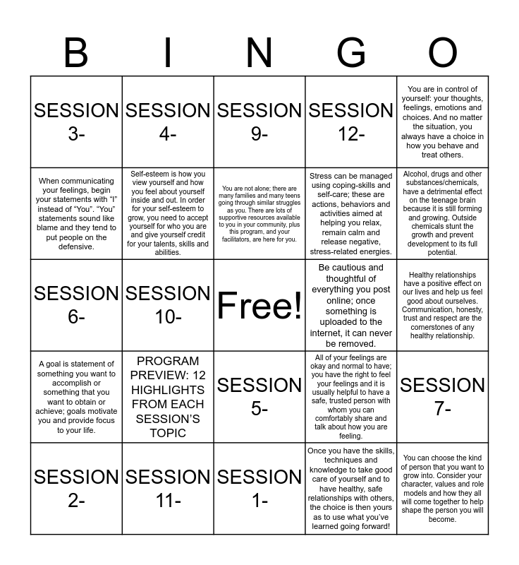 This bingo card has a free space and 25 words: PROGRAM PREVIEW: 12 HIGHLIGHTS FROM EACH SESSION’S TOPIC, SESSION 1-, You are not alone; there are many families and many teens going through similar struggles as you. There are lots of supportive resources available to you in your community, plus this program, and your facilitators, are here for you., SESSION 2-, You are in control of yourself: your thoughts, feelings, emotions and choices. And no matter the situation, you always have a choice in how you behave and treat others., SESSION 3-, When communicating your feelings, begin your statements with “I” instead of “You”. “You” statements sound like blame and they tend to put people on the defensive., SESSION 4-, Be cautious and thoughtful of everything you post online; once something is uploaded to the internet, it can never be removed., SESSION 5-, Stress can be managed using coping-skills and self-care; these are actions, behaviors and activities aimed at helping you relax, remain calm and release negative, stress-related energies., SESSION 6-, All of your feelings are okay and normal to have; you have the right to feel your feelings and it is usually helpful to have a safe, trusted person with whom you can comfortably share and talk about how you are feeling., SESSION 7-, Self-esteem is how you view yourself and how you feel about yourself inside and out. In order for your self-esteem to grow, you need to accept yourself for who you are and give yourself credit for your talents, skills and abilities., SESSION 8 -, Healthy relationships have a positive effect on our lives and help us feel good about ourselves. Communication, honesty, trust and respect are the cornerstones of any healthy relationship., SESSION 9-, Alcohol, drugs and other substances/chemicals, have a detrimental effect on the teenage brain because it is still forming and growing. Outside chemicals stunt the growth and prevent development to its full potential., SESSION 10-, You can choose the kind of person that you want to grow into. Consider your character, values and role models and how they all will come together to help shape the person you will become., SESSION 11-, A goal is statement of something you want to accomplish or something that you want to obtain or achieve; goals motivate you and provide focus to your life., SESSION 12- and Once you have the skills, techniques and knowledge to take good care of yourself and to have healthy, safe relationships with others, the choice is then yours as to use what you’ve learned going forward!.