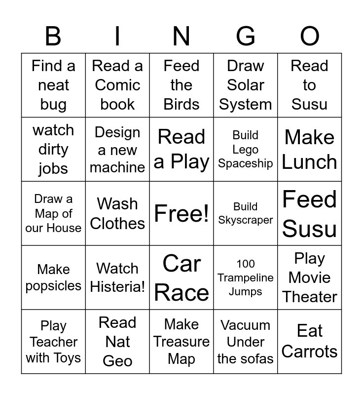 This bingo card has a free space and 24 words: Watch Histeria!, Read Nat Geo, Read a Play, Play Teacher with Toys, Read to Susu, Find a neat bug, watch dirty jobs, Read a Comic book, Build Skyscraper, Car Race, Build Lego Spaceship, Draw a Map of our House, 100 Trampeline Jumps, Play Movie Theater, Design a new machine, Vacuum Under the sofas, Feed Susu, Feed the Birds, Make Lunch, Wash Clothes, Eat Carrots, Make popsicles, Draw Solar System and Make Treasure Map.