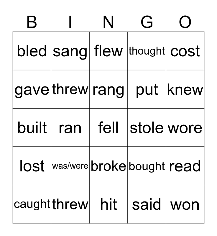 This bingo card has 25 words: was/were, hit, rang, caught, cost, bled, gave, sang, stole, broke, put, built, bought, read, threw, won, wore, flew, knew, ran, fell, threw, lost, thought and said.