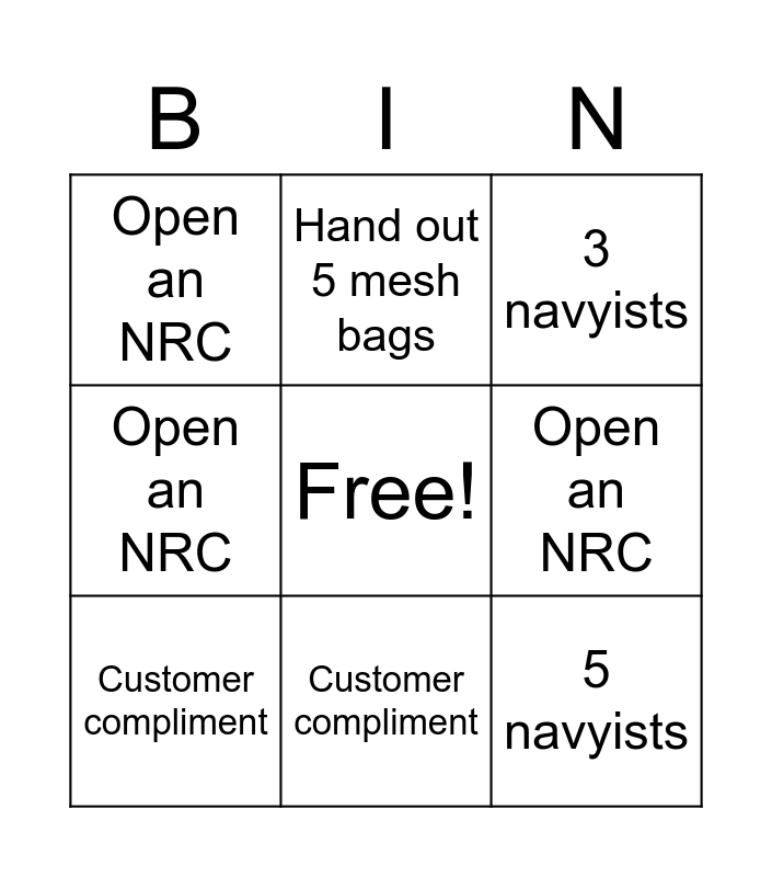 This bingo card has a free space and 8 words: Open an NRC, 3 navyists, Hand out 5 mesh bags, Customer compliment, Open an NRC, 5 navyists, Open an NRC and Customer compliment.