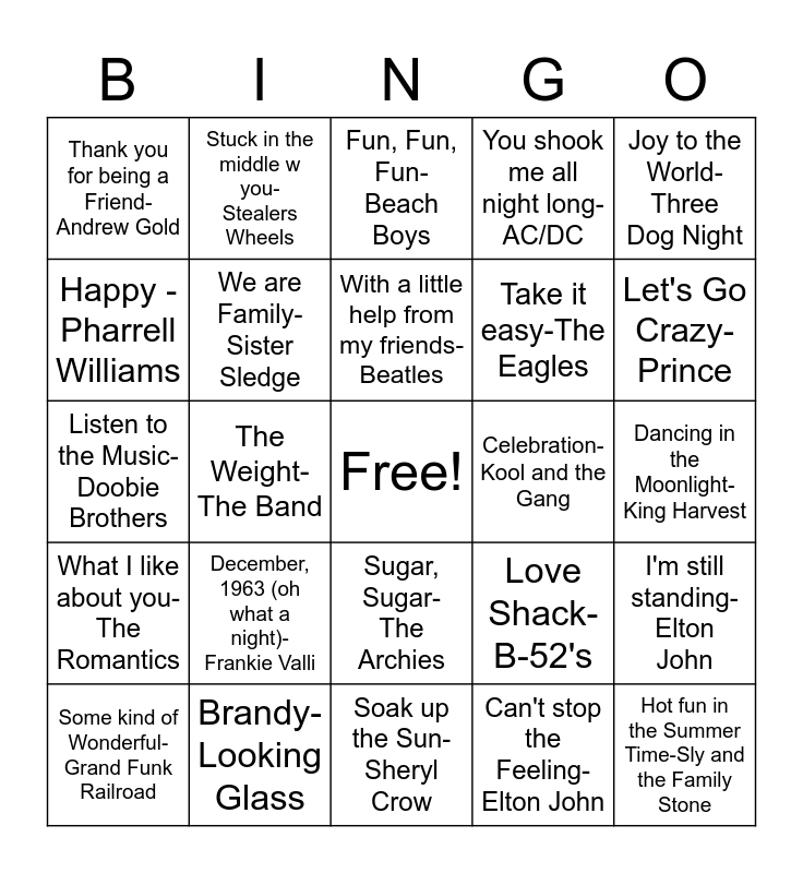 This bingo card has a free space and 30 words: Brandy-Looking Glass, Behind Blue Eyes-The Who, The Weight-The Band, Birthday-Beatles, Thank you for being a Friend-Andrew Gold, Fun, Fun, Fun- Beach Boys, We are Family-Sister Sledge, Sugar, Sugar-The Archies, Celebration- Kool and the Gang, Soak up the Sun-Sheryl Crow, Dancing in the Moonlight- King Harvest, Hot fun in the Summer Time-Sly and the Family Stone, Can't stop the Feeling-Elton John, Don't stop til you get enough-Michael Jackson, Let's Go Crazy-Prince, Get down tonight-KC & the Sunshine Band, Love Shack-B-52's, What I like about you- The Romantics, December, 1963 (oh what a night)- Frankie Valli, Joy to the World-Three Dog Night, Listen to the Music- Doobie Brothers, Piano Man-Billy Joel, Stuck in the middle w you- Stealers Wheels, Take it easy-The Eagles, Happy - Pharrell Williams, You shook me all night long-AC/DC, I'm still standing- Elton John, Some kind of Wonderful- Grand Funk Railroad, With a little help from my friends- Beatles and Soul Man- Sam & Dave.