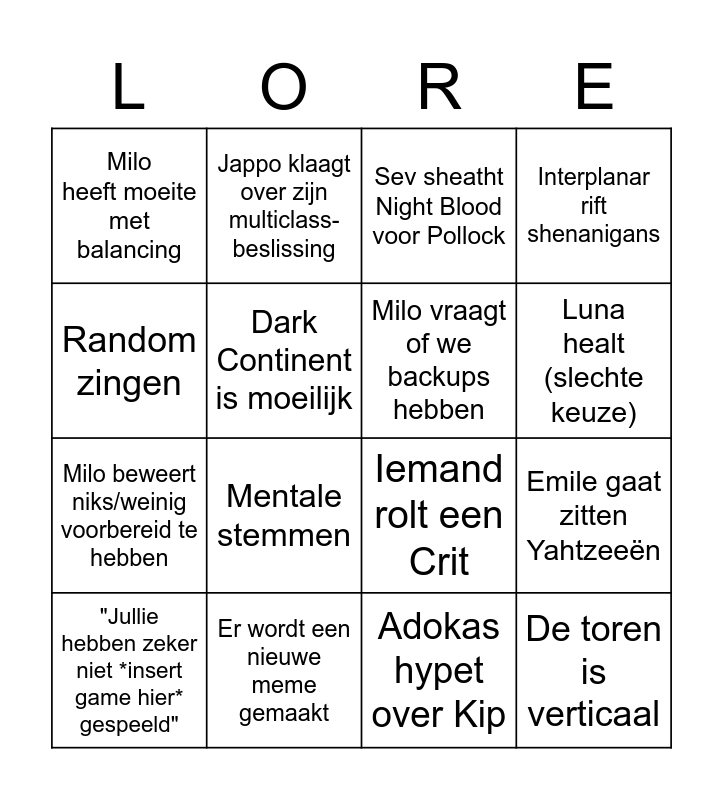 This bingo card has 26 words: Pollock trekt Night Blood, Instagram magic item, Luna healt (slechte keuze), Iemand stelt bier voor, Random zingen, Milo heeft moeite met balancing, Dark Continent is moeilijk, Jappo klaagt over zijn multiclass-beslissing, Adokas hypet over Kip, Wild Magic Surge, Milo beweert niks/weinig voorbereid te hebben, Iemand rolt een Crit, JoPo huilt over Ghost, JoPo klaagt over hoe wij rangers zien, Emile gaat zitten Yahtzeeën, Milo doet een loredump door een NPC, Interplanar rift shenanigans, De toren is verticaal, Sev sheatht Night Blood voor Pollock, "Jullie hebben zeker niet *insert game hier* gespeeld", Mentale stemmen, Discussie over eten, Er wordt een nieuwe meme gemaakt, Er sterft een karakter, Milo vraagt of we backups hebben and Een hamer verschijnt uit het niks.