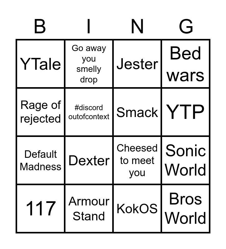 This bingo card has 16 words: Armour Stand, Sonic World, Jester, YTale, Default Madness, Go away you smelly drop, Cheesed to meet you, KokOS, Rage of rejected, #discord outofcontext, 117, Bed wars, Dexter, YTP, Smack and Bros World.