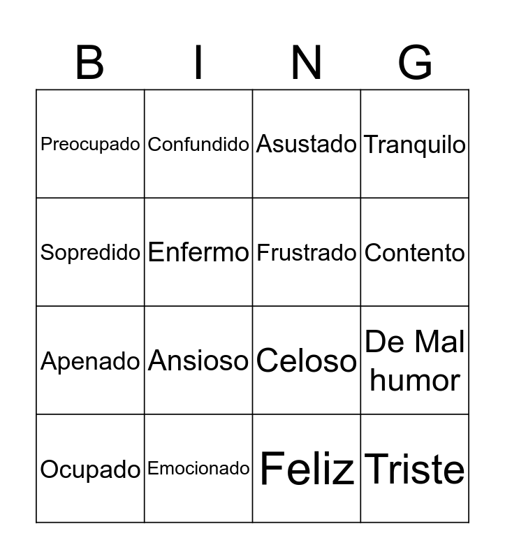 This bingo card has a free space and 15 words: Ocupado, Triste, Asustado, Preocupado, Contento, Sopredido, Ansioso, Feliz, Enfermo, Apenado, De Mal humor, Tranquilo, Frustrado, Confundido and Emocionado.