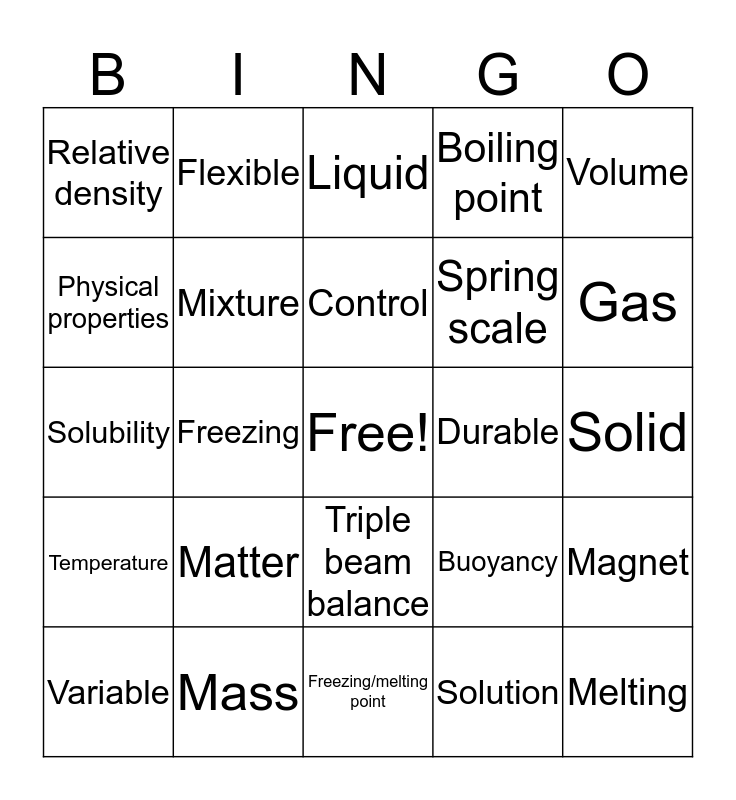 This bingo card has a free space and 24 words: Matter, Mass, Control, Variable, Volume, Relative density, Physical properties, Flexible, Durable, Triple beam balance, Spring scale, Solubility, Buoyancy, Magnet, Mixture, Solution, Solid, Liquid, Gas, Freezing, Melting, Temperature, Boiling point and Freezing/melting point.