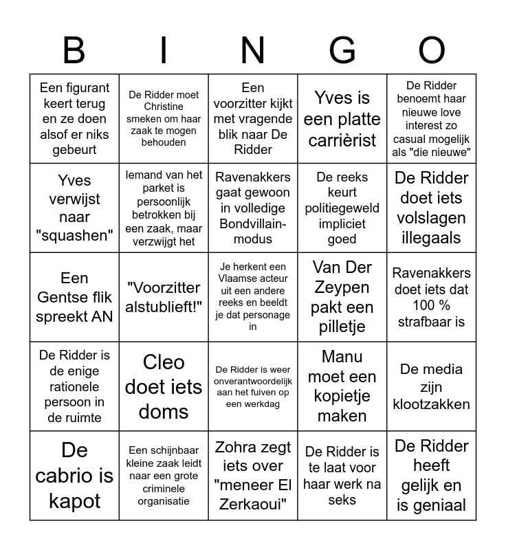 This bingo card has 25 words: Cleo doet iets doms, Zohra zegt iets over "meneer El Zerkaoui", Ravenakkers gaat gewoon in volledige Bondvillain-modus, De cabrio is kapot, De Ridder benoemt haar nieuwe love interest zo casual mogelijk als "die nieuwe", Een figurant keert terug en ze doen alsof er niks gebeurt, Yves verwijst naar "squashen", De Ridder moet Christine smeken om haar zaak te mogen behouden, Van Der Zeypen pakt een pilletje, De Ridder is weer onverantwoordelijk aan het fuiven op een werkdag, De reeks keurt politiegeweld impliciet goed, Een Gentse flik spreekt AN, Manu moet een kopietje maken, De media zijn klootzakken, Iemand van het parket is persoonlijk betrokken bij een zaak, maar verzwijgt het, De Ridder heeft gelijk en is geniaal, Ravenakkers doet iets dat 100 % strafbaar is, Een voorzitter kijkt met vragende blik naar De Ridder, De Ridder doet iets volslagen illegaals, "Voorzitter alstublieft!", Je herkent een Vlaamse acteur uit een andere reeks en beeldt je dat personage in, Een schijnbaar kleine zaak leidt naar een grote criminele organisatie, De Ridder is de enige rationele persoon in de ruimte, Yves is een platte carrièrist and De Ridder is te laat voor haar werk na seks.