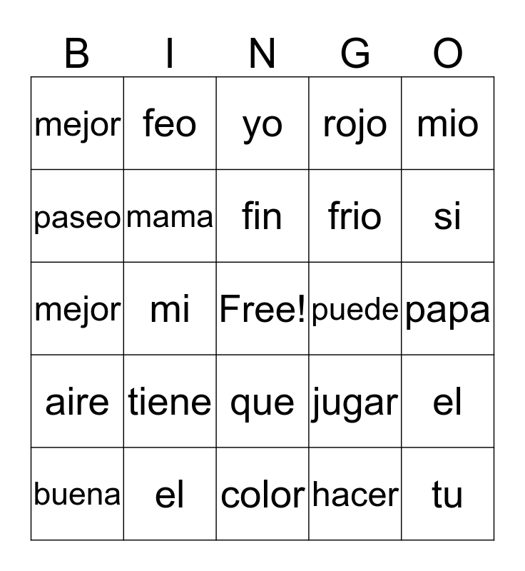 This bingo card has a free space and 24 words: tiene, el, fin, buena, mio, mejor, paseo, feo, puede, que, frio, mejor, jugar, el, mama, hacer, papa, yo, si, mi, tu, aire, rojo and color.