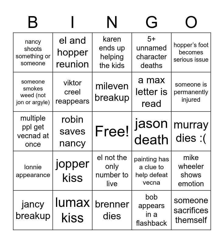 This bingo card has a free space and 24 words: jopper kiss, lumax kiss, mileven breakup, jancy breakup, hopper’s foot becomes serious issue, nancy shoots something or someone, someone smokes weed (not jon or argyle), el and hopper reunion, jason death, el not the only number to live, a max letter is read, multiple ppl get vecnad at once, painting has a clue to help defeat vecna, mike wheeler shows emotion, viktor creel reappears, bob appears in a flashback, murray dies :(, karen ends up helping the kids, someone is permanently injured, robin saves nancy, someone sacrifices themself, lonnie appearance, 5+ unnamed character deaths and brenner dies.