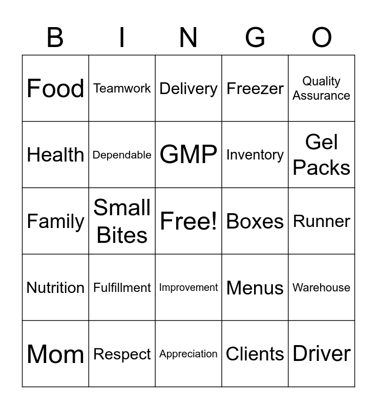 This bingo card has a free space and 24 words: Mom, Fulfillment, GMP, Clients, Quality Assurance, Food, Teamwork, Delivery, Boxes, Runner, Family, Dependable, Menus, Warehouse, Health, Respect, Appreciation, Freezer, Gel Packs, Nutrition, Small Bites, Improvement, Inventory and Driver.
