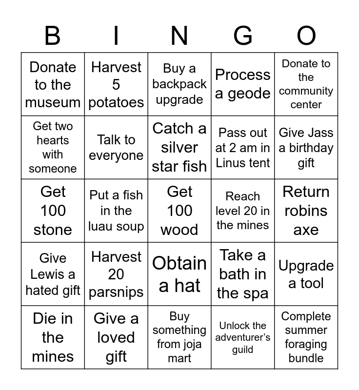 This bingo card has a free space and 24 words: Harvest 20 parsnips, Give a loved gift, Catch a silver star fish, Die in the mines, Donate to the community center, Donate to the museum, Get two hearts with someone, Harvest 5 potatoes, Reach level 20 in the mines, Obtain a hat, Pass out at 2 am in Linus tent, Get 100 stone, Take a bath in the spa, Upgrade a tool, Talk to everyone, Unlock the adventurer’s guild, Return robins axe, Buy a backpack upgrade, Give Jass a birthday gift, Put a fish in the luau soup, Complete summer foraging bundle, Give Lewis a hated gift, Process a geode and Buy something from joja mart.