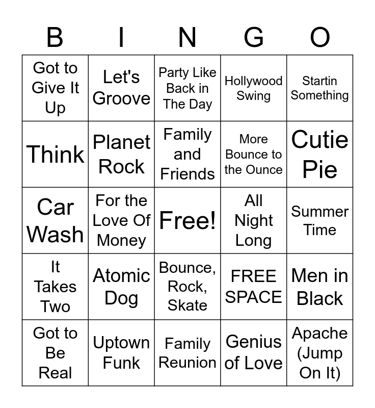This bingo card has a free space and 25 words: Atomic Dog, Family Reunion, Family and Friends, Got to Be Real, Startin Something, Got to Give It Up, Think, Let's Groove, All Night Long, Bounce, Rock, Skate, More Bounce to the Ounce, Car Wash, FREE SPACE, Men in Black, Planet Rock, Remember the Time, Summer Time, Party Like Back in The Day, Cutie Pie, For the Love Of Money, Apache (Jump On It), Uptown Funk, It Takes Two, Hollywood Swing and Genius of Love.