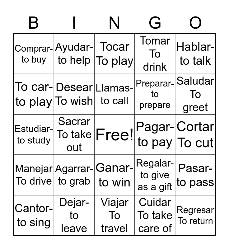 This bingo card has a free space and 24 words: Agarrar- to grab, Dejar- to leave, Llamas-to call, Cantor-to sing, Hablar- to talk, Comprar- to buy, To car- to play, Ayudar- to help, Pagar- to pay, Ganar- to win, Preparar- to prepare, Estudiar-to study, Regalar- to give as a gift, Pasar- to pass, Desear To wish, Cuidar To take care of, Cortar To cut, Tocar To play, Saludar To greet, Sacrar To take out, Regresar To return, Manejar To drive, Tomar To drink and Viajar To travel.