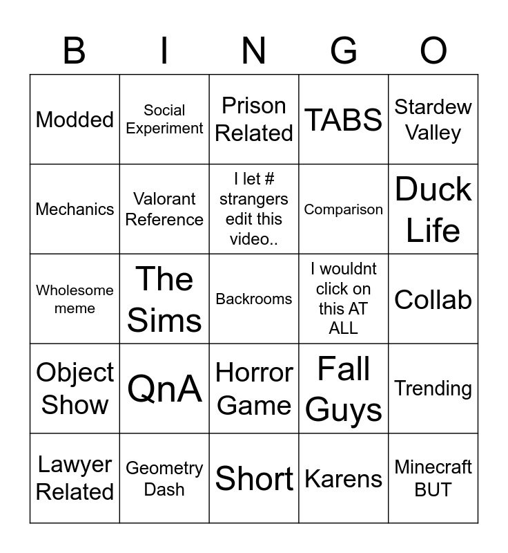 This bingo card has a free space and 74 words: Shows, You get banned if.., Prison Related, Who Is This, Flag Reference, Shocked Thumbnail Face, Rubix Cube, Riddle, Lawyer Related, Dhar Mann, Liar, Planets, I let # strangers edit this video.., Mechanics, Omegle Video, The Sims, Math, Duck Life, Onevilage, Wholesome meme, Valorant Reference, Social Experiment, TABS, NPCS Are becoming smart, Minecraft BUT, Roblox, Geography Channel, Drew Durnil, Jellybean Hate, Among Us, Stardew Valley, Cringe Video, 20+ Minutes, Backrooms, Danganronpa, Karens, EmKay, New Game, Music Video, Chess, Short, Geometry Dash, Cursed, Gacha Life, Cringe, Modded, Fun Fact, QnA, 5 things that..., "Relatable", I Would Click On This, 1+ Hours or more, Collab, Beluga, Exposing, Ranking Video, Horror Game, Uploaded 2 years ago, Uploaded 1 hour ago, Trending, Comparison, Movie Recap, Object Show, Cringe Thumbnail, I wouldnt click on this AT ALL, Debate, Flexing, I will end this video if..., Fall Guys, New Topic, 5 Minute Crafts, Animal, Vlog and Dont Laugh Video.