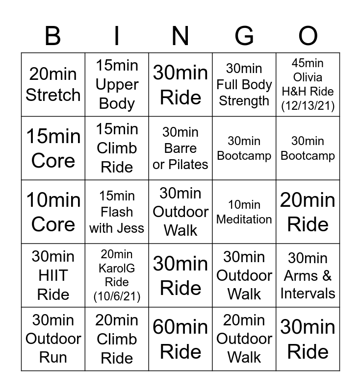 This bingo card has 25 words: 20min KarolG Ride (10/6/21), 60min Ride, 30min Barre or Pilates, 30min Outdoor Run, 45min Olivia H&H Ride (12/13/21), 20min Stretch, 15min Core, 15min Upper Body, 10min Meditation, 30min Ride, 30min Bootcamp, 10min Core, 30min Outdoor Walk, 30min Arms & Intervals, 15min Climb Ride, 30min Ride, 20min Ride, 30min Ride, 30min Bootcamp, 15min Flash with Jess, 30min Outdoor Walk, 20min Climb Ride, 30min HIIT Ride, 30min Full Body Strength and 20min Outdoor Walk.