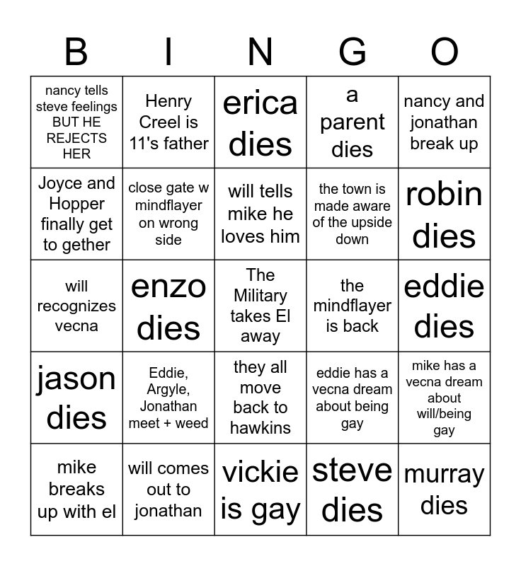 This bingo card has a free space and 24 words: Eddie, Argyle, Jonathan meet + weed, will comes out to jonathan, will tells mike he loves him, mike breaks up with el, nancy and jonathan break up, nancy tells steve feelings BUT HE REJECTS HER, Joyce and Hopper finally get to gether, Henry Creel is 11's father, the mindflayer is back, they all move back to hawkins, the town is made aware of the upside down, will recognizes vecna, eddie has a vecna dream about being gay, mike has a vecna dream about will/being gay, close gate w mindflayer on wrong side, steve dies, eddie dies, erica dies, robin dies, enzo dies, murray dies, jason dies, a parent dies and vickie is gay.