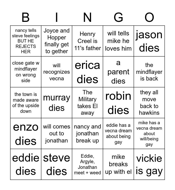 This bingo card has a free space and 24 words: eddie dies, will comes out to jonathan, erica dies, mike breaks up with el, jason dies, nancy tells steve feelings BUT HE REJECTS HER, Joyce and Hopper finally get to gether, Henry Creel is 11's father, robin dies, they all move back to hawkins, the town is made aware of the upside down, will recognizes vecna, eddie has a vecna dream about being gay, mike has a vecna dream about will/being gay, close gate w mindflayer on wrong side, steve dies, Eddie, Argyle, Jonathan meet + weed, will tells mike he loves him, the mindflayer is back, enzo dies, murray dies, nancy and jonathan break up, a parent dies and vickie is gay.