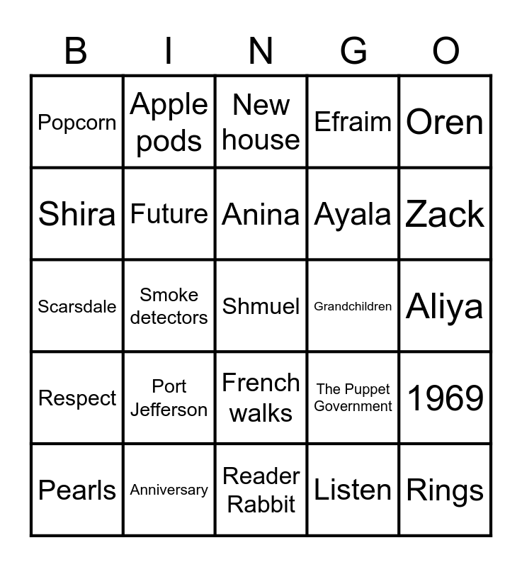 This bingo card has 62 words: Free!, Anniversary, Children, Respect, Rings, 30, Future, Dreams, Ayala, Chana, Efraim, Yosef, Shira, David, Sasha, Popcorn, Shmuel, Oren, Yaara, Anina, Grandchildren, New house, Pearls, Listen, Secrets to success, Frozen bananas, Spinning, Home Hotel, 1969, 1992, Chess, Shutterfly, Two old men dancing, Canarsie, Aliya, Apple pods, Smart house, Awesome vacations, Smoke detectors, Unsolicited advice, Scarsdale, Plainview, Port Jefferson, Eli, Zack, The Puppet Government, Sunshine, Chicago, Eyeshades, Accomplishments, French walks, Reader Rabbit, Quilts, Socialism, Rabbi Lord Jonathan Sacks, Ema, Abba, Tzfat, The Hunt for the Afikomen, Scrabble club, Lullim and Friday lunch Pizza.