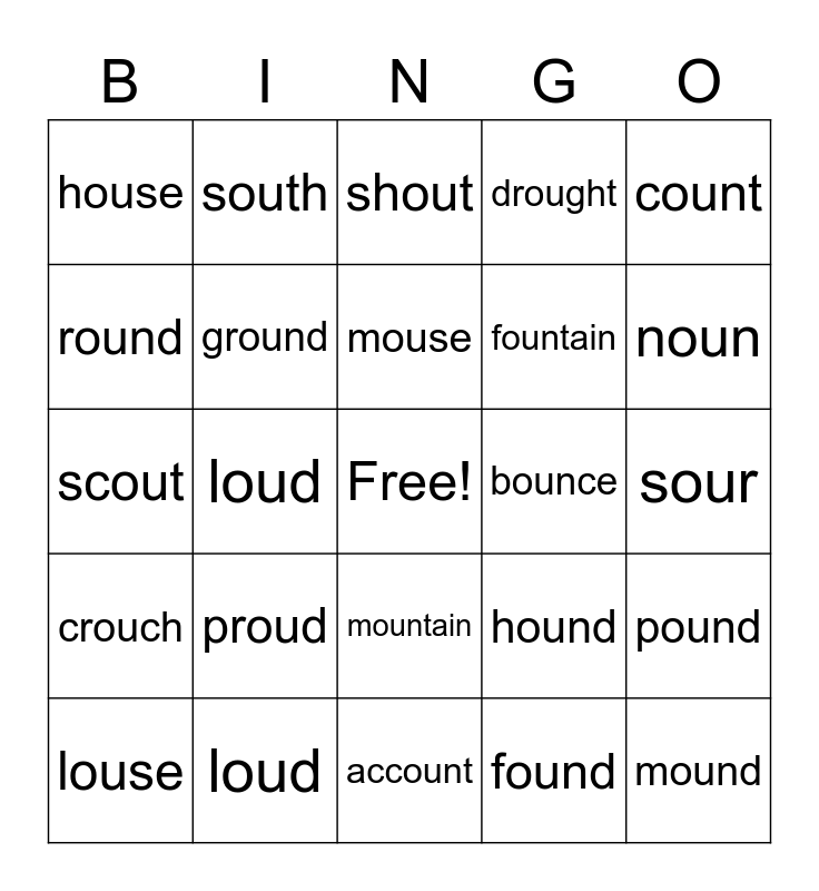 This bingo card has a free space and 24 words: proud, loud, mouse, louse, count, house, round, south, bounce, mountain, fountain, scout, hound, pound, ground, found, sour, shout, noun, loud, mound, crouch, drought and account.