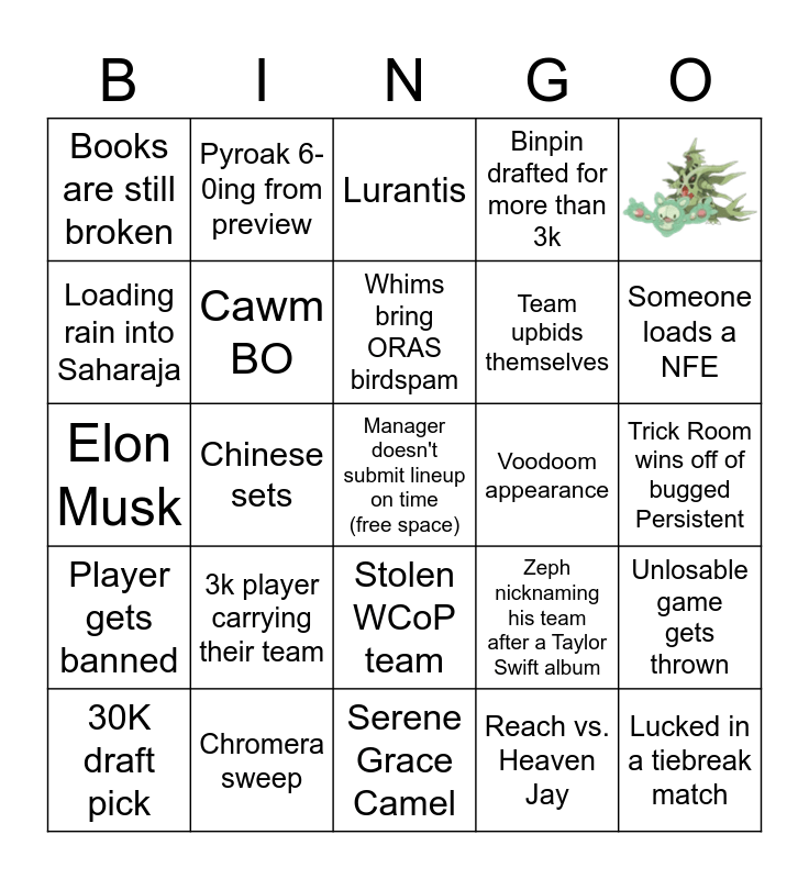 This bingo card has 1 images, a free space and 23 words: 3k player carrying their team, Chromera sweep, Whims bring ORAS birdspam, 30K draft pick, Books are still broken, Loading rain into Saharaja, Pyroak 6-0ing from preview, Voodoom appearance, Stolen WCoP team, Team upbids themselves, Elon Musk, Zeph nicknaming his team after a Taylor Swift album, Unlosable game gets thrown, Cawm BO, Reach vs. Heaven Jay, Trick Room wins off of bugged Persistent, Lurantis, Someone loads a NFE, Chinese sets, Lucked in a tiebreak match, Player gets banned, Binpin drafted for more than 3k and Serene Grace Camel.