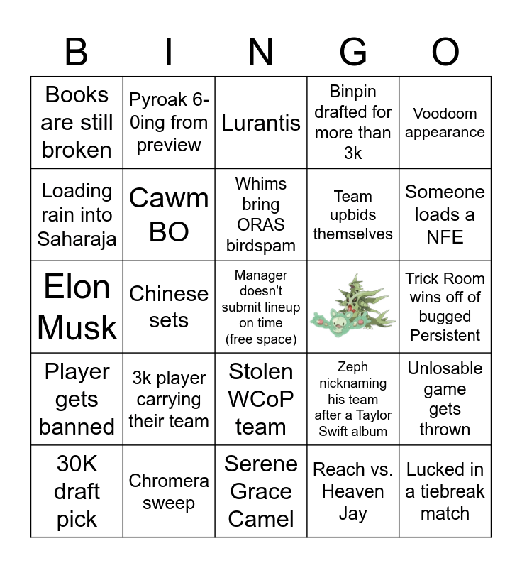 This bingo card has 1 images, a free space and 23 words: 3k player carrying their team, Chromera sweep, Whims bring ORAS birdspam, 30K draft pick, Voodoom appearance, Books are still broken, Loading rain into Saharaja, Pyroak 6-0ing from preview, Stolen WCoP team, Team upbids themselves, Elon Musk, Zeph nicknaming his team after a Taylor Swift album, Unlosable game gets thrown, Cawm BO, Reach vs. Heaven Jay, Trick Room wins off of bugged Persistent, Lurantis, Someone loads a NFE, Chinese sets, Lucked in a tiebreak match, Player gets banned, Binpin drafted for more than 3k and Serene Grace Camel.