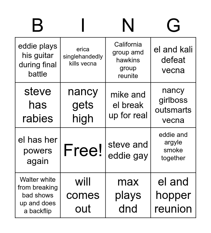 This bingo card has 16 words: will comes out, eddie and argyle smoke together, California group amd hawkins group reunite, eddie plays his guitar during final battle, el has her powers again, erica singlehandedly kills vecna, steve and eddie gay, max plays dnd, steve has rabies, nancy gets high, Walter white from breaking bad shows up and does a backflip, el and kali defeat vecna, Free!, nancy girlboss outsmarts vecna, mike and el break up for real and el and hopper reunion.
