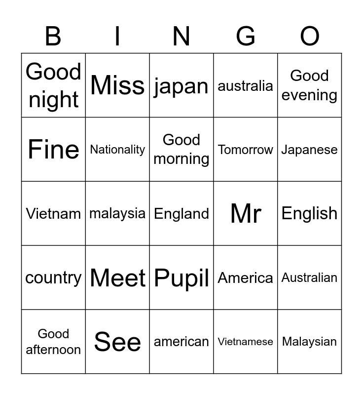 This bingo card has a free space and 24 words: Meet, See, Good morning, Good afternoon, Good evening, Good night, Fine, Miss, Mr, Pupil, Tomorrow, Vietnam, America, Australian, Nationality, Vietnamese, English, japan, Japanese, malaysia, Malaysian, country, australia and american.