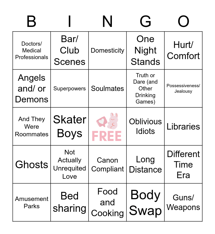 This bingo card has a free space and 24 words: Not Actually Unrequited Love, Bed sharing, Soulmates, Amusement Parks, Hurt/ Comfort, Doctors/ Medical Professionals, Angels and/ or Demons, Bar/ Club Scenes, Oblivious Idiots, Canon Compliant, Truth or Dare (and Other Drinking Games), And They Were Roommates, Long Distance, Different Time Era, Superpowers, Body Swap, Libraries, Domesticity, Possessiveness/ Jealousy, Skater Boys, Guns/ Weapons, Ghosts, One Night Stands and Food and Cooking.