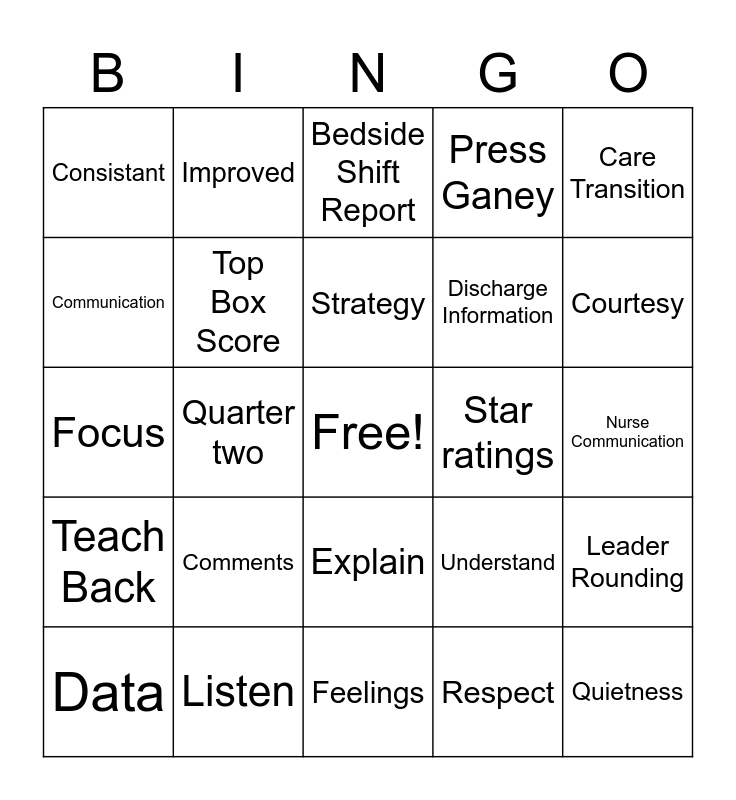 This bingo card has a free space and 24 words: Data, Comments, Strategy, Respect, Care Transition, Consistant, Improved, Bedside Shift Report, Star ratings, Nurse Communication, Focus, Top Box Score, Understand, Leader Rounding, Communication, Listen, Feelings, Press Ganey, Courtesy, Teach Back, Quarter two, Explain, Discharge Information and Quietness.