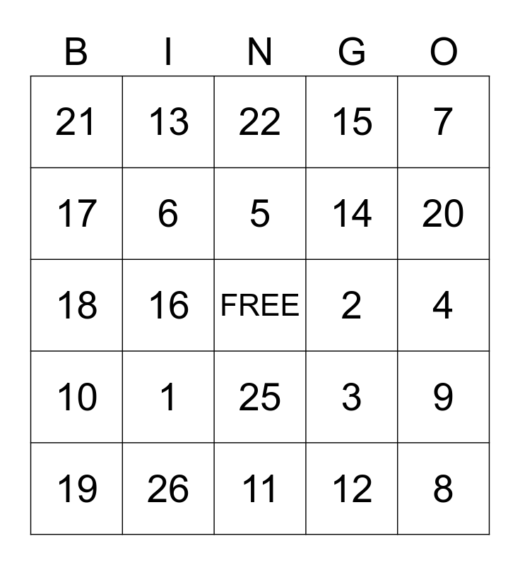 This bingo card has a free space and 24 words: 1, 26, 5, 19, 7, 21, 17, 13, 2, 25, 14, 18, 3, 9, 6, 12, 4, 22, 20, 16, 8, 10, 15 and 11.
