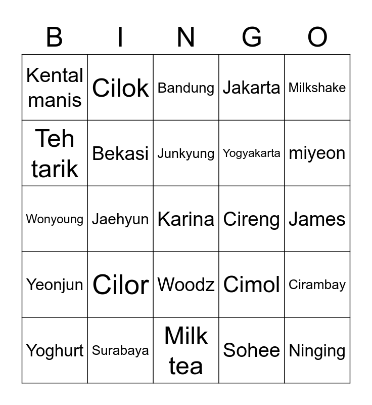 This bingo card has 25 words: Cilor, Milk tea, Junkyung, Yoghurt, Milkshake, Kental manis, Teh tarik, Cilok, Cireng, Woodz, Yogyakarta, Wonyoung, Cimol, Cirambay, Bekasi, Ninging, James, Bandung, miyeon, Jaehyun, Karina, Surabaya, Yeonjun, Jakarta and Sohee.
