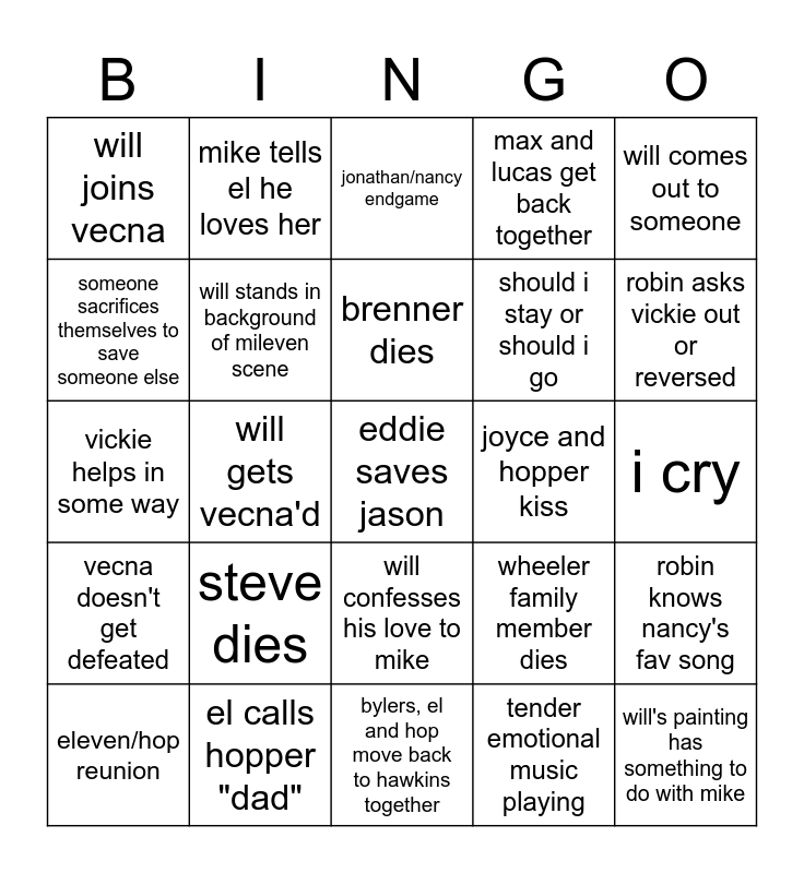 This bingo card has a free space and 24 words: steve dies, el calls hopper "dad", brenner dies, eleven/hop reunion, will comes out to someone, will joins vecna, someone sacrifices themselves to save someone else, mike tells el he loves her, joyce and hopper kiss, will confesses his love to mike, should i stay or should i go, vickie helps in some way, wheeler family member dies, robin knows nancy's fav song, will stands in background of mileven scene, tender emotional music playing, i cry, jonathan/nancy endgame, robin asks vickie out or reversed, will gets vecna'd, will's painting has something to do with mike, vecna doesn't get defeated, max and lucas get back together and bylers, el and hop move back to hawkins together.