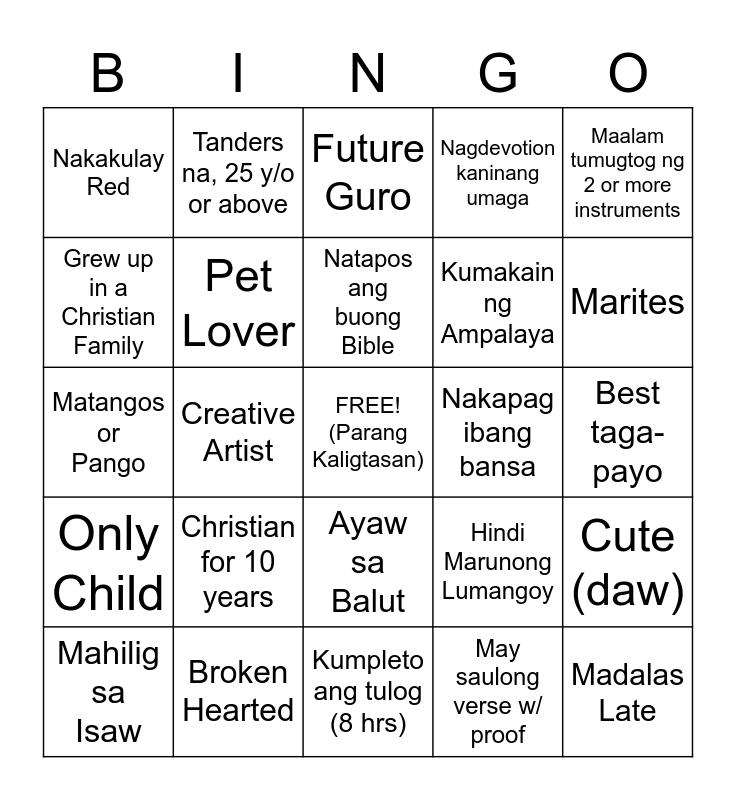 This bingo card has a free space and 24 words: Christian for 10 years, Broken Hearted, Natapos ang buong Bible, Mahilig sa Isaw, Maalam tumugtog ng 2 or more instruments, Nakakulay Red, Grew up in a Christian Family, Tanders na, 25 y/o or above, Nakapag ibang bansa, Ayaw sa Balut, Kumakain ng Ampalaya, Matangos or Pango, Hindi Marunong Lumangoy, Cute (daw), Pet Lover, May saulong verse w/ proof, Best taga-payo, Future Guro, Marites, Creative Artist, Madalas Late, Only Child, Nagdevotion kaninang umaga and Kumpleto ang tulog (8 hrs).