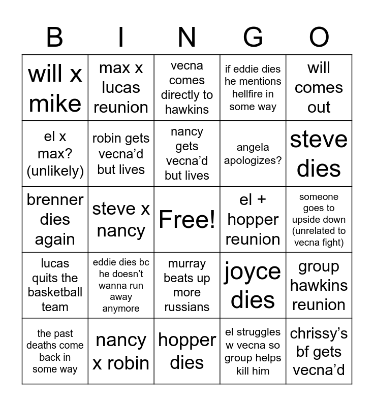 This bingo card has a free space and 24 words: eddie dies bc he doesn’t wanna run away anymore, nancy x robin, nancy gets vecna’d but lives, the past deaths come back in some way, will comes out, will x mike, el x max? (unlikely), max x lucas reunion, el + hopper reunion, murray beats up more russians, angela apologizes?, brenner dies again, joyce dies, group hawkins reunion, robin gets vecna’d but lives, el struggles w vecna so group helps kill him, someone goes to upside down (unrelated to vecna fight), vecna comes directly to hawkins, steve dies, steve x nancy, chrissy’s bf gets vecna’d, lucas quits the basketball team, if eddie dies he mentions hellfire in some way and hopper dies.