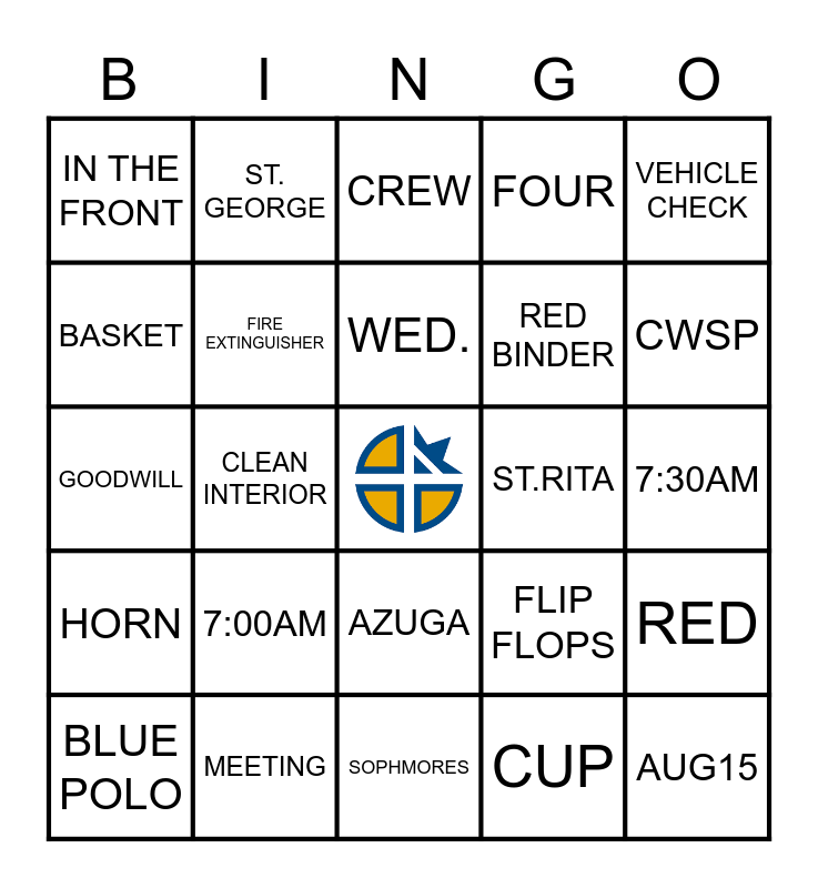 This bingo card has a free space and 39 words: CRFW, DRIVE TEAM HUDDLE, GRIT, FIRE EXTINGUISHER, BLUE POLO, AZUGA, WED., IPHONE, VEHICLE CHECK, HORN, CLEAN INTERIOR, FOUR, AUG15, 7:30AM, ST.RITA, 7:00AM, ALCON, IN THE FRONT, MS.WOODS, FLIP FLOPS, BASKET, SOPHMORES, RED BINDER, CWSP, T-SHIRT, NEW STUDENTS, MON., AUG. 22, 7:05AM, ST. GEORGE, FIVE, WHITE BINDER, CREW, MEETING, CUP, FRESHMEN, RED, GOODWILL and ALL SAINTS.